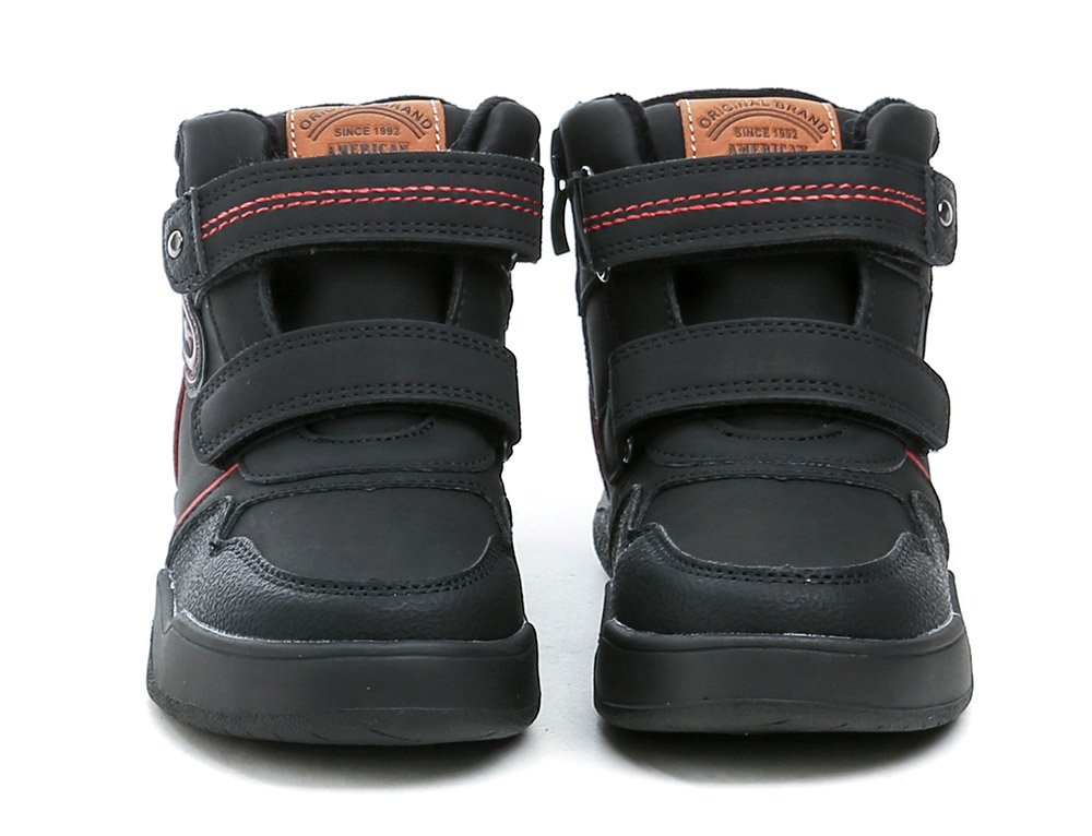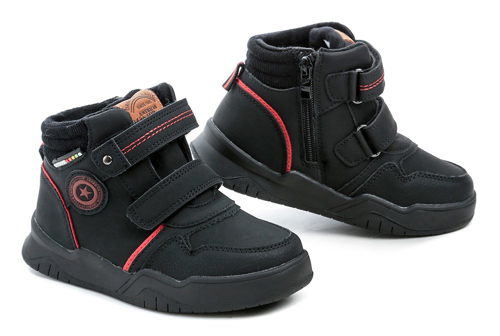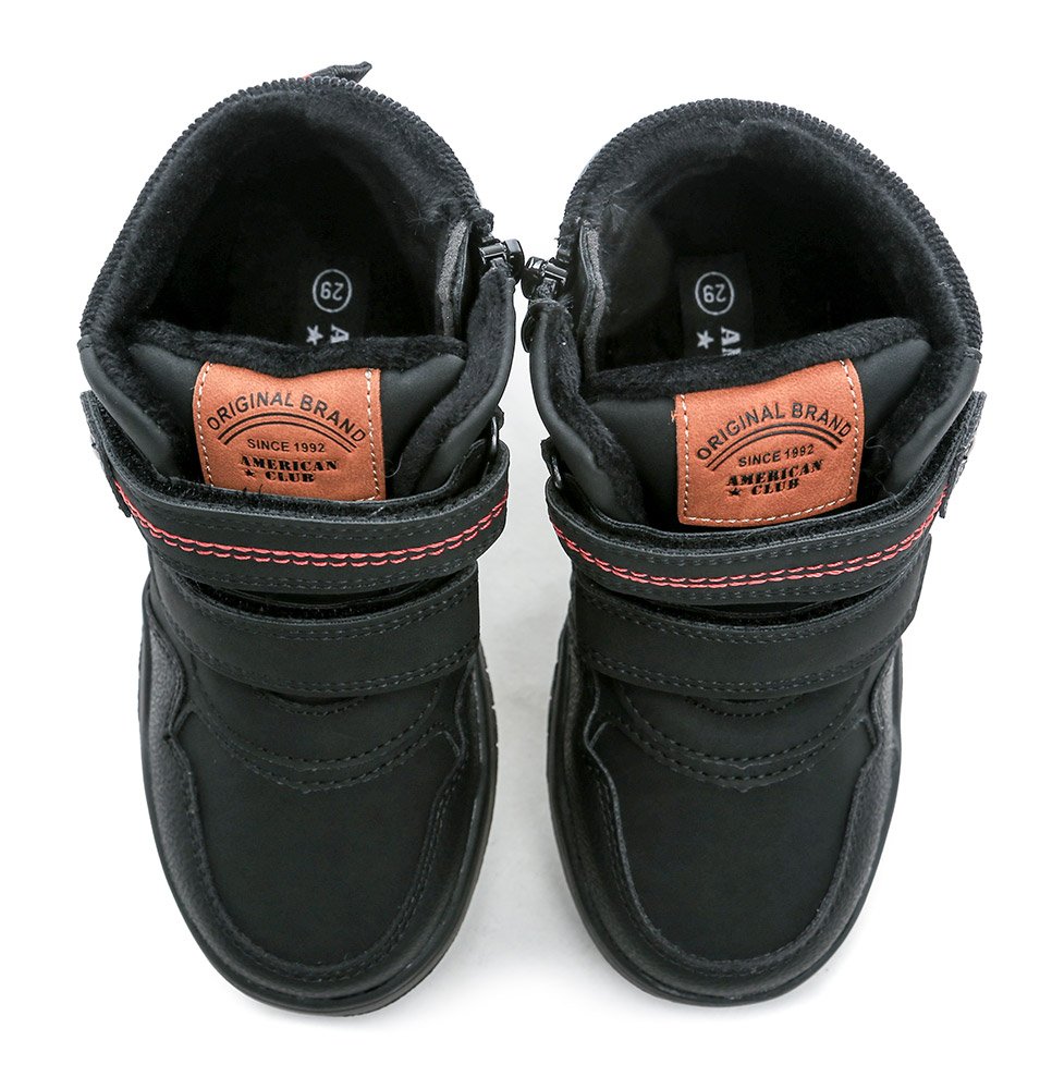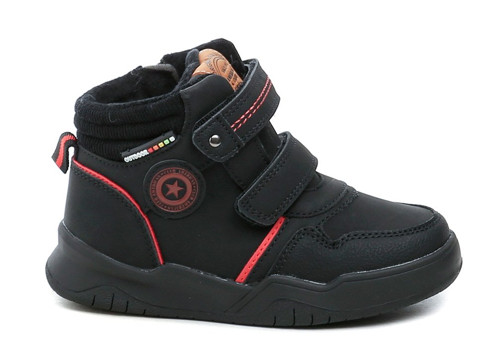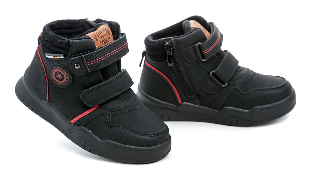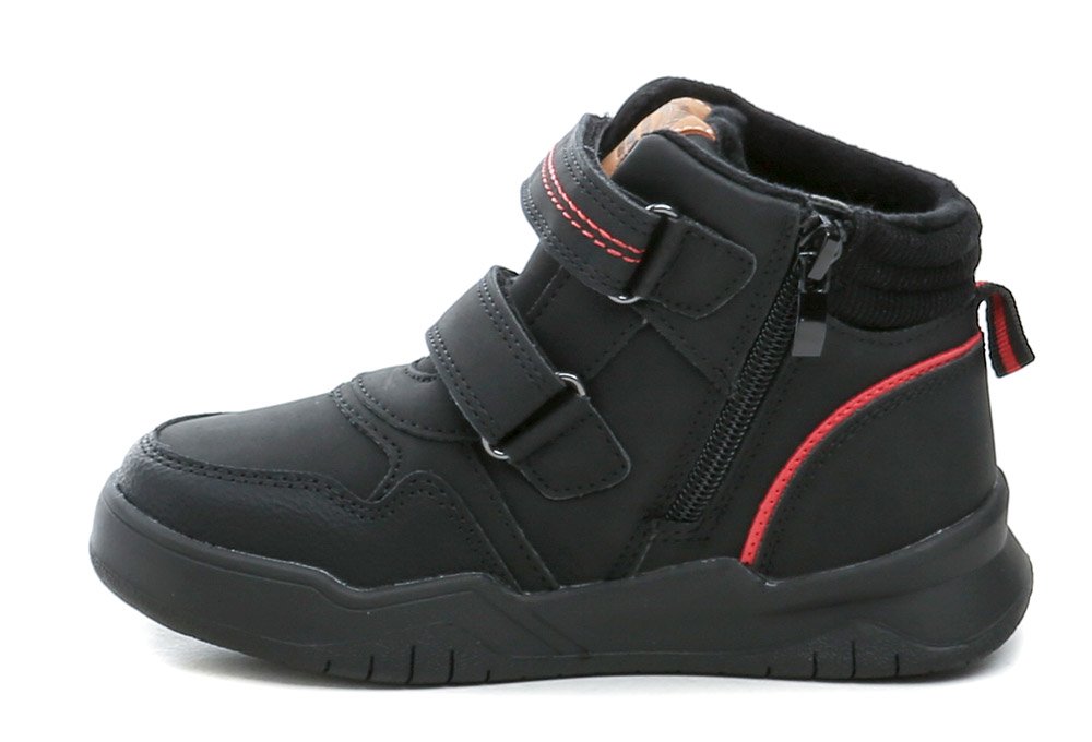 Kinder-Winterstiefeletten mit normalem Reißverschluss und 2 Klettverschlüssen. Die Schuhe bestehen aus einer Kombination aus Synthetik- und Textilmaterial und sind mit weichem Wildleder isoliert.