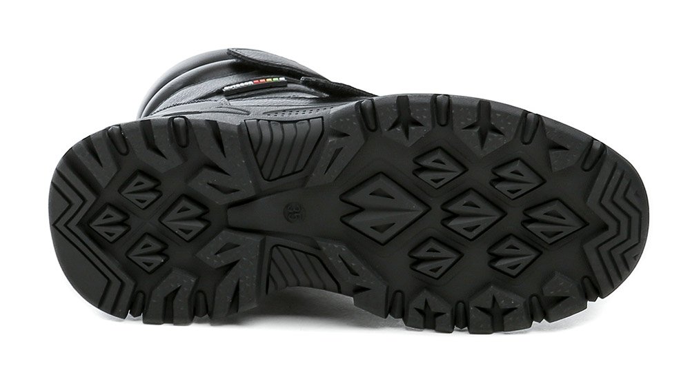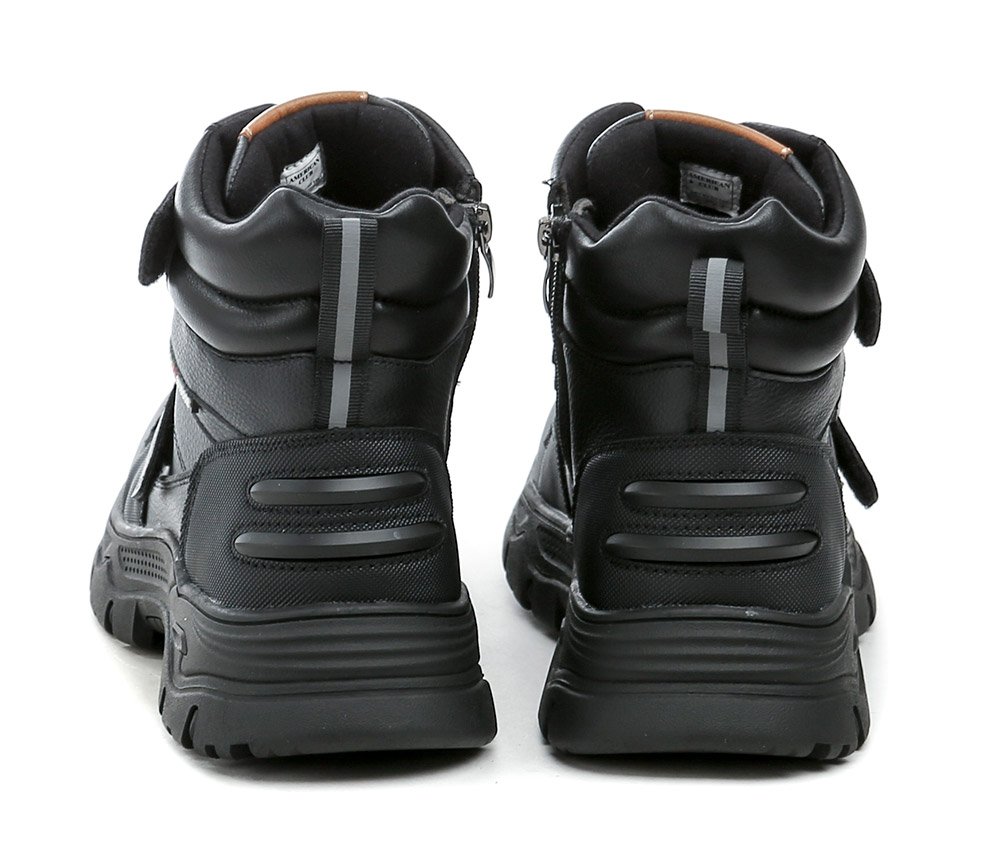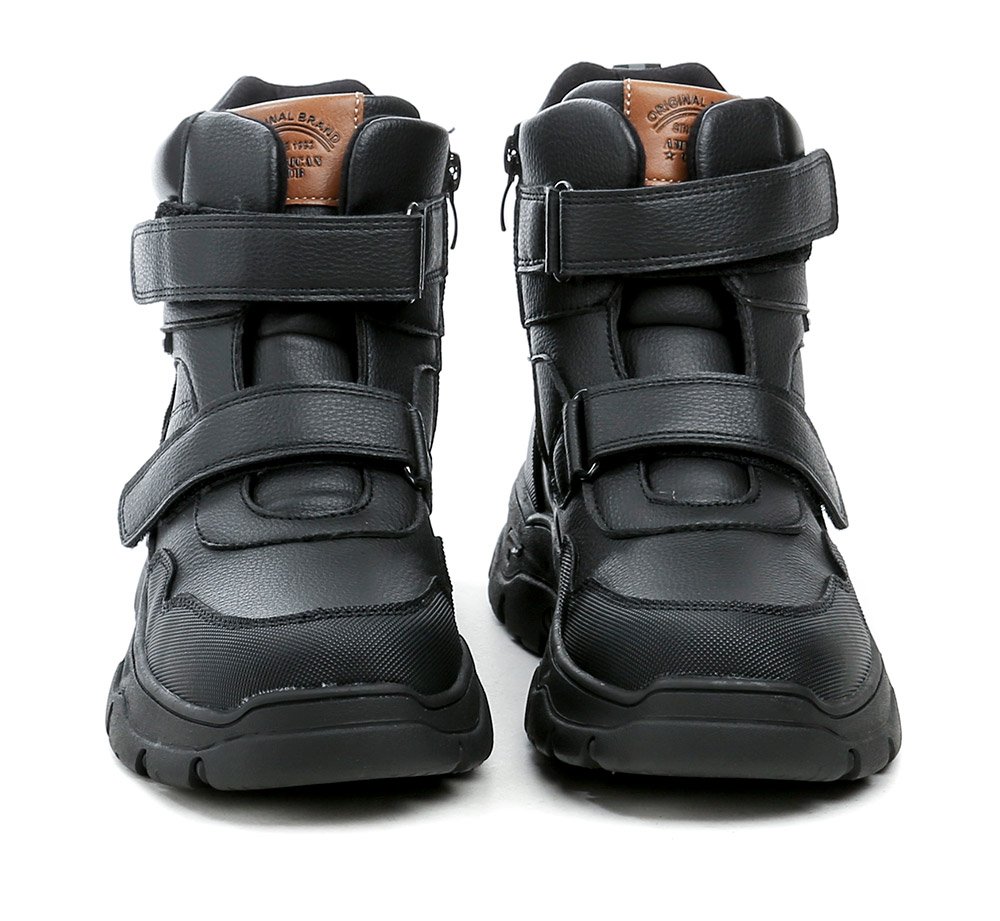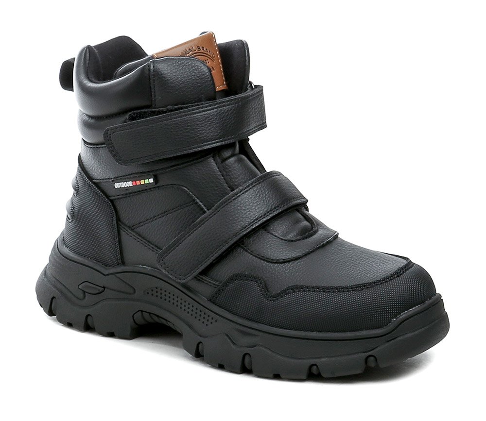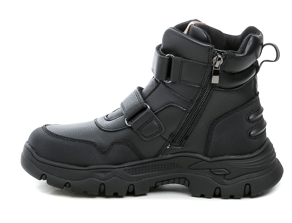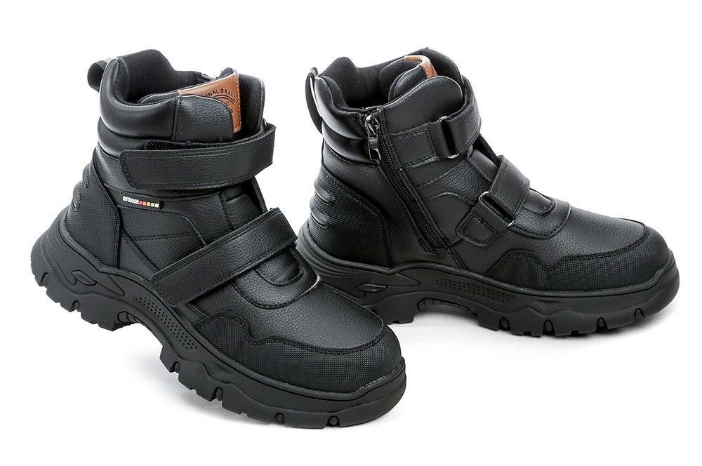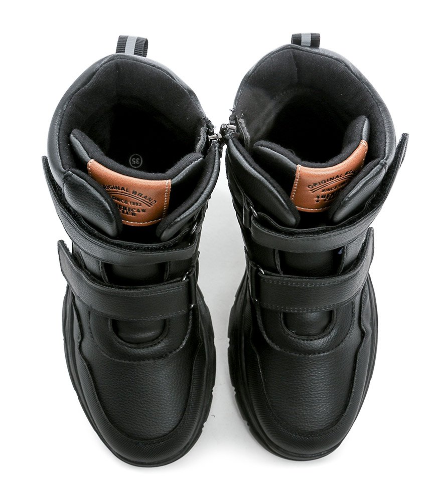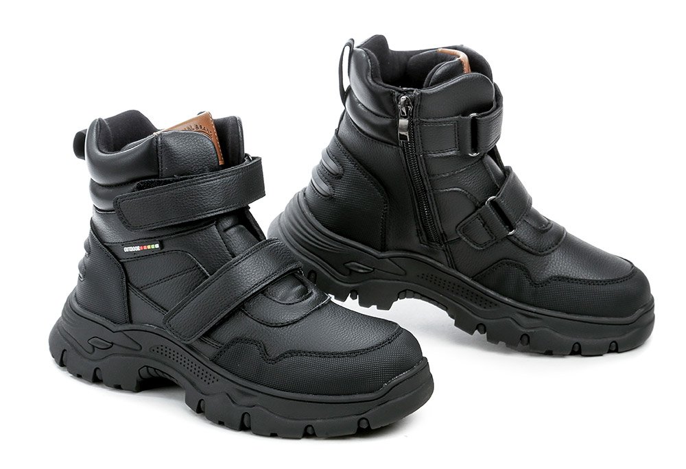 Kinder-Winterstiefeletten mit normalem Reißverschluss und 2 Klettverschlüssen. Die Schuhe bestehen aus einer Kombination aus Synthetik- und Textilmaterial und sind mit weichem Wildleder isoliert.
