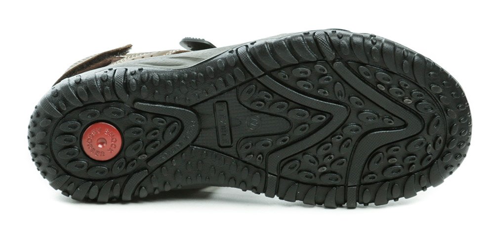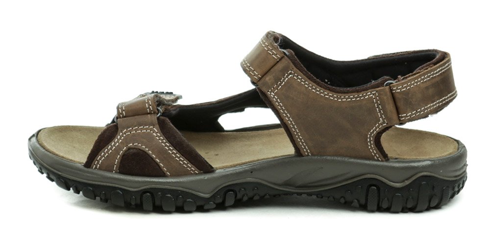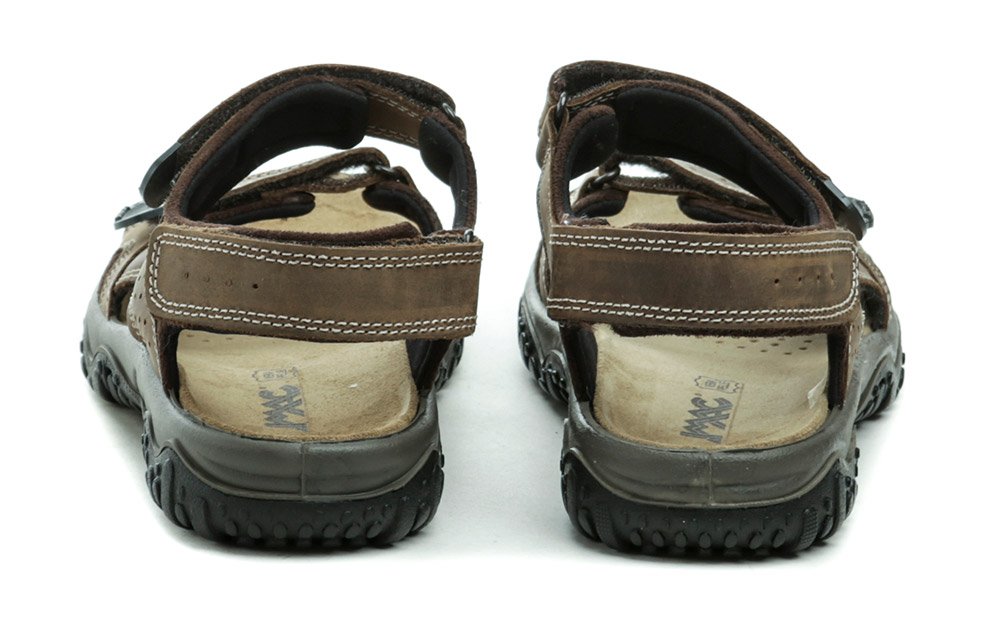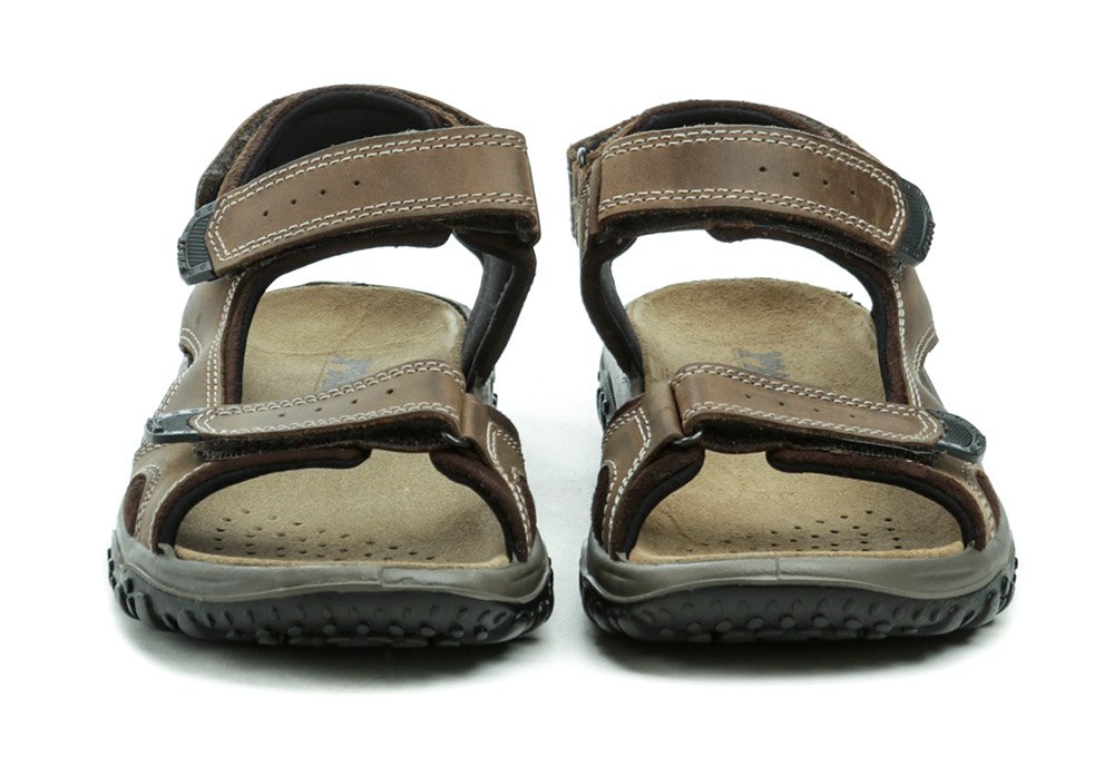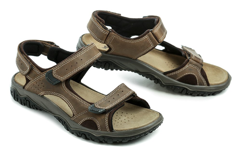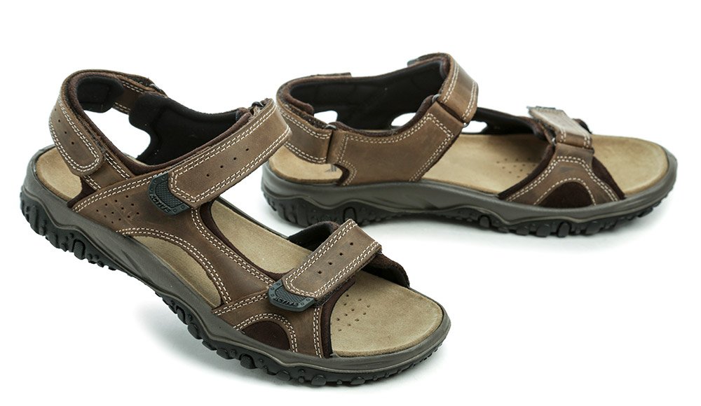 Herren-Sommer-Wandersandalen mit Klettverschluss. Die Schuhe sind aus echtem Naturleder in Kombination mit Textilmaterial hergestellt.