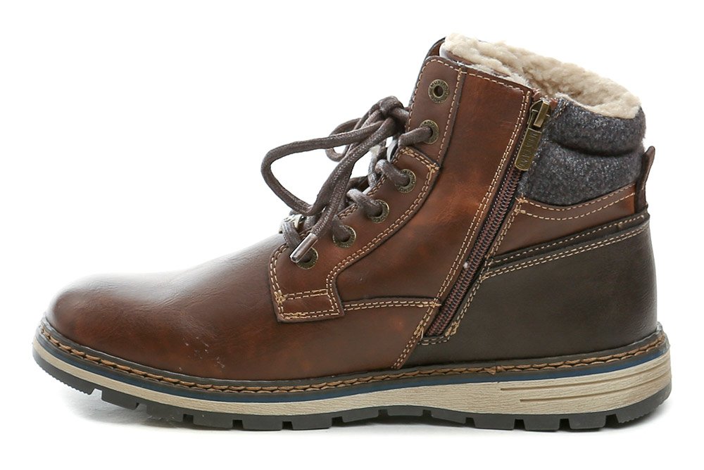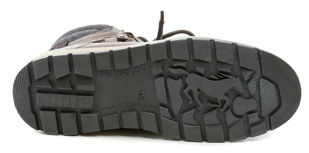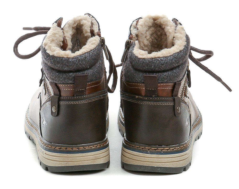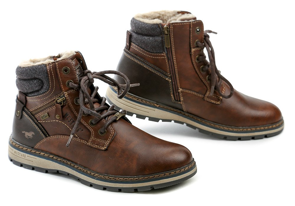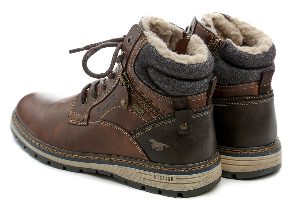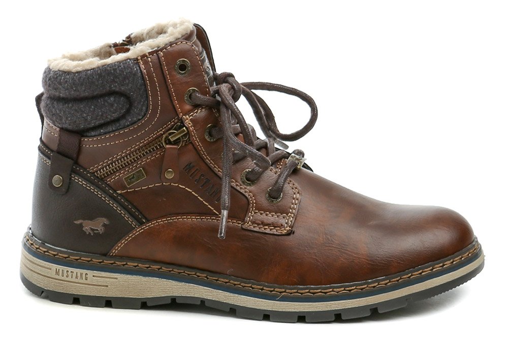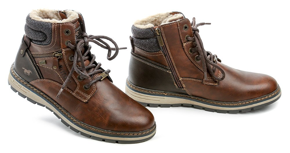 Herren-Winterstiefeletten mit Schnürung und Reißverschluss. Die Schuhe bestehen aus synthetischem Material mit MustangTEX-Membran, innen mit flauschigem Textilfell isoliert.