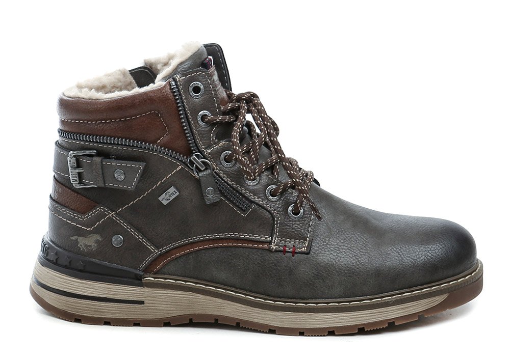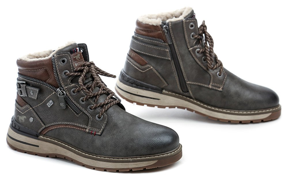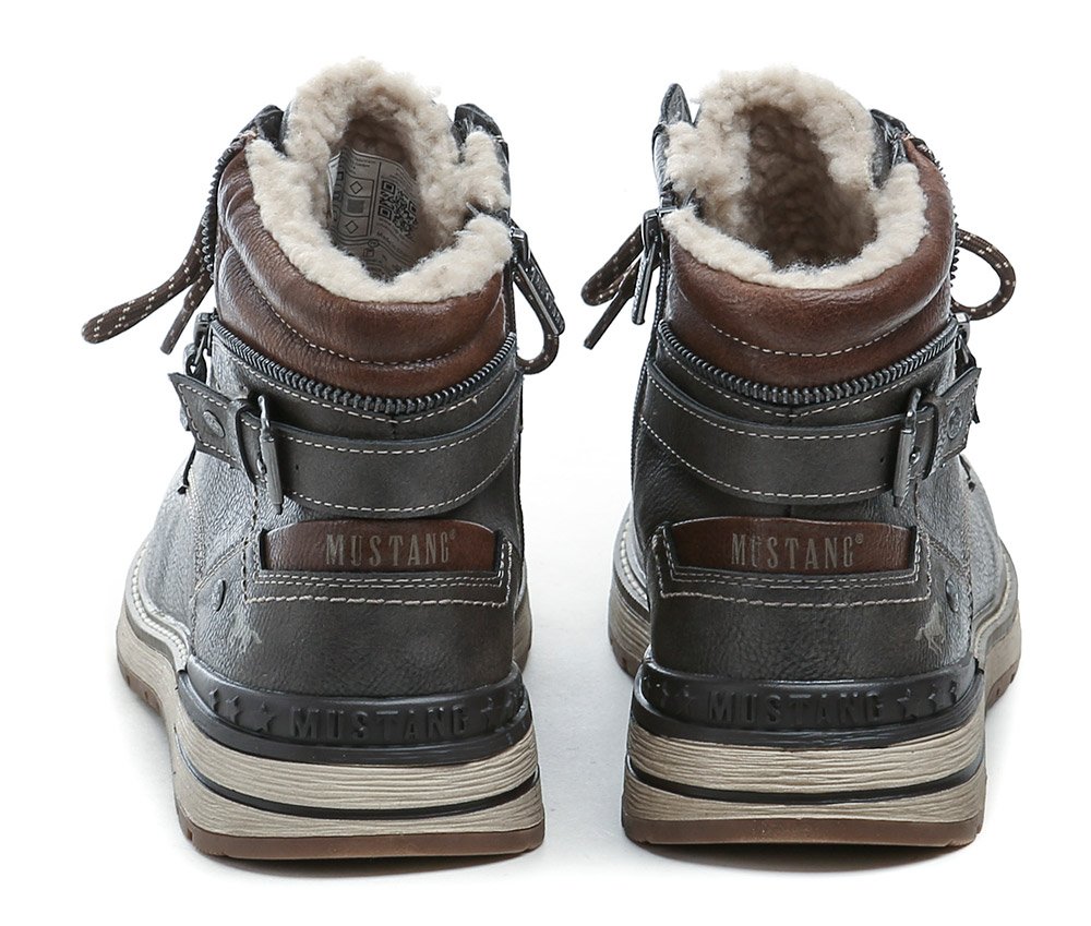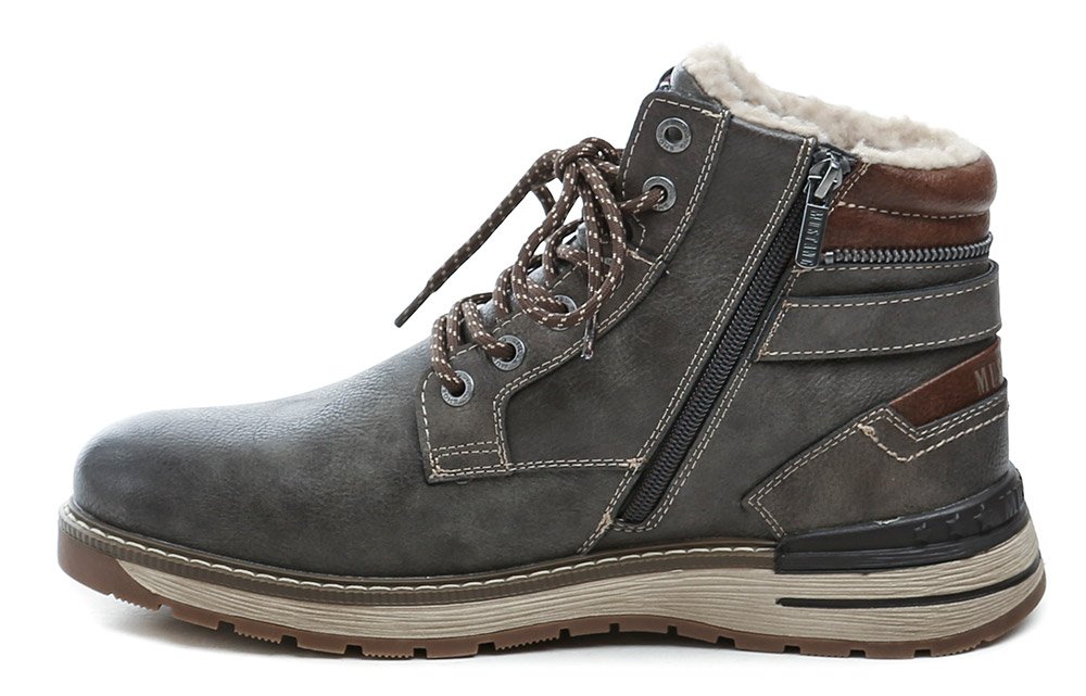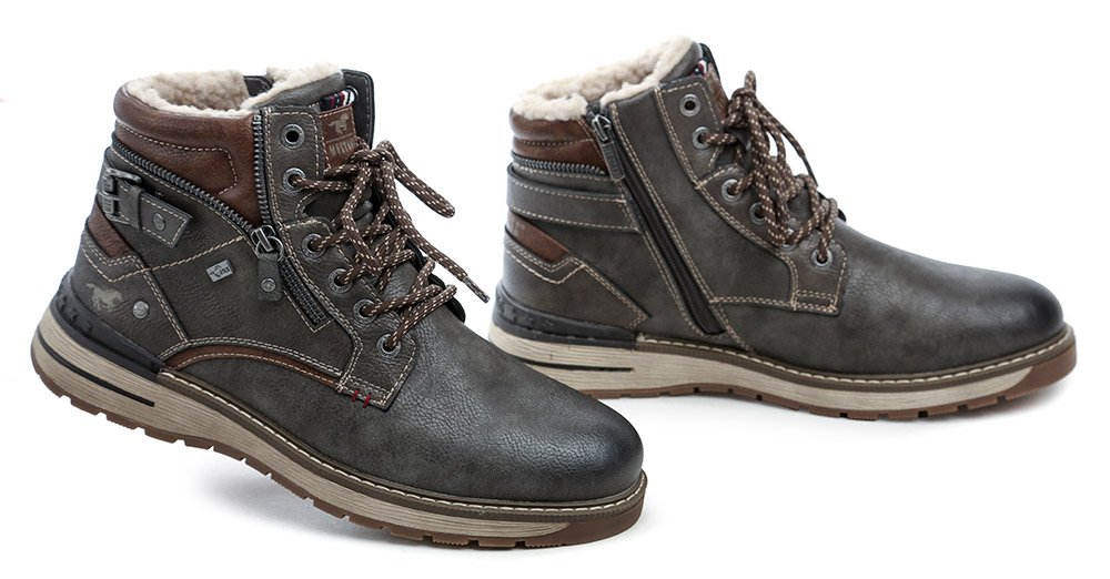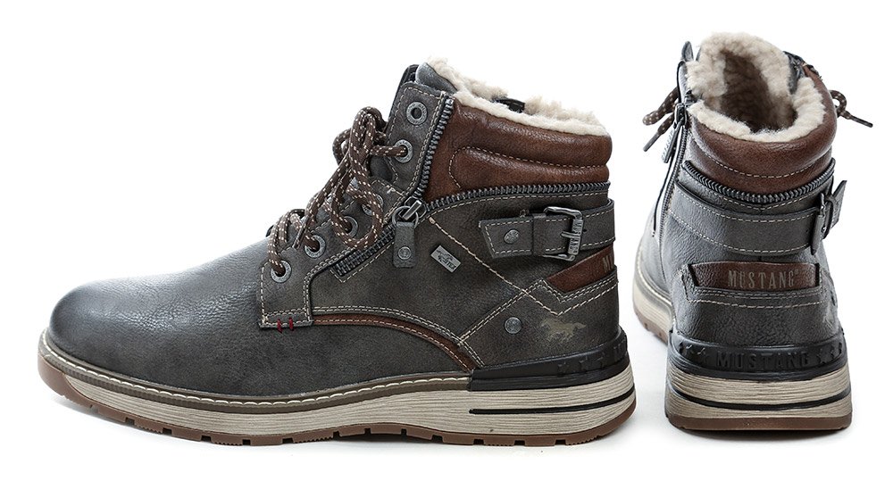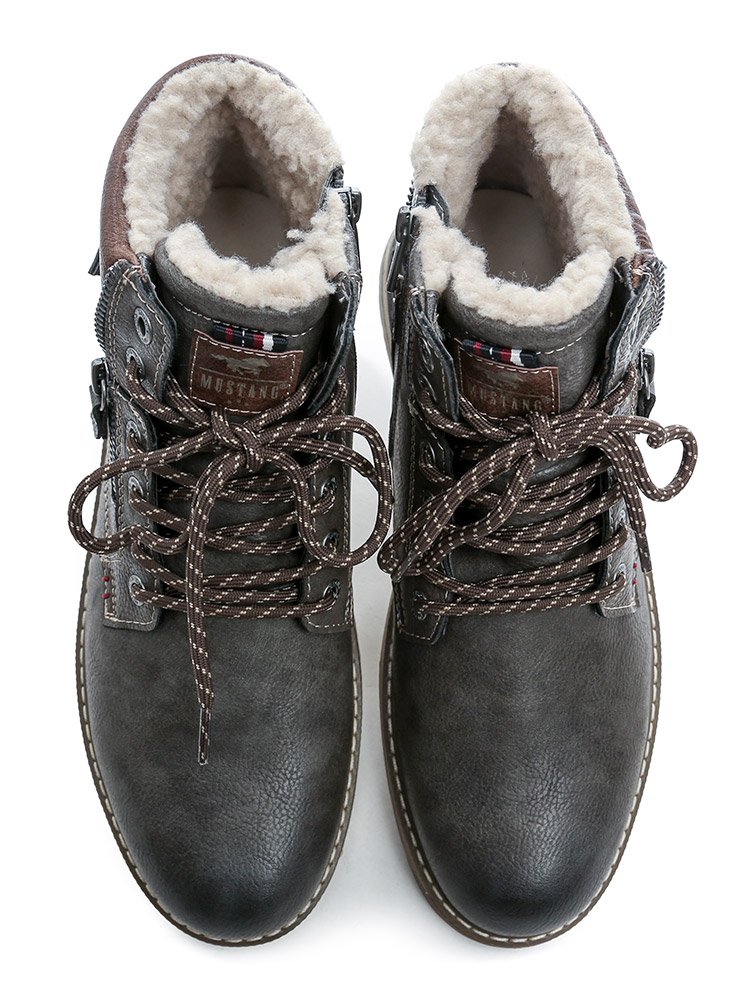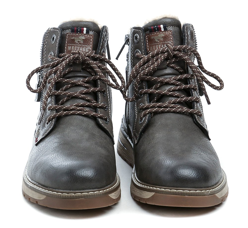 Herren-Winterstiefeletten mit Schnürung und Reißverschluss. Die Schuhe bestehen aus synthetischem Material mit MustangTEX-Membran, innen mit flauschigem Textilfell isoliert.