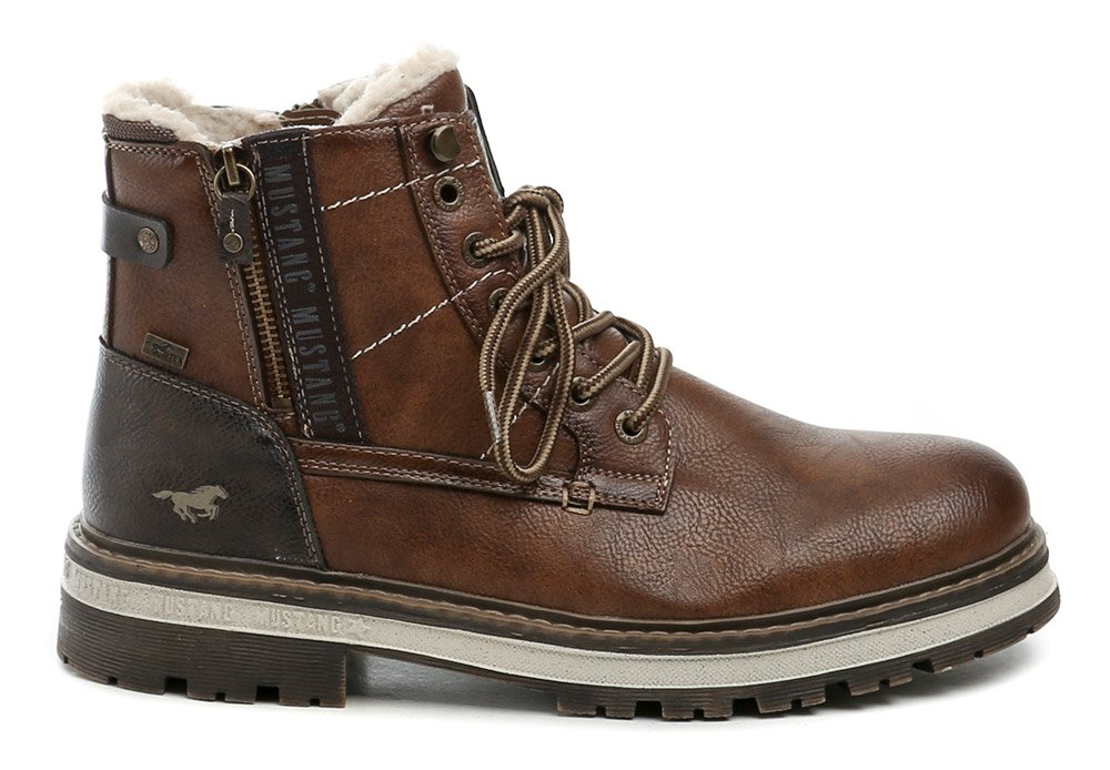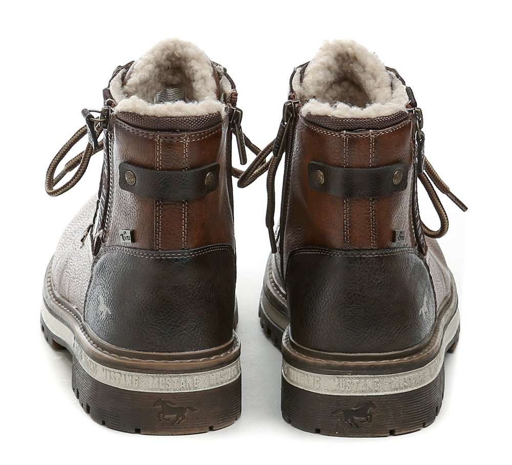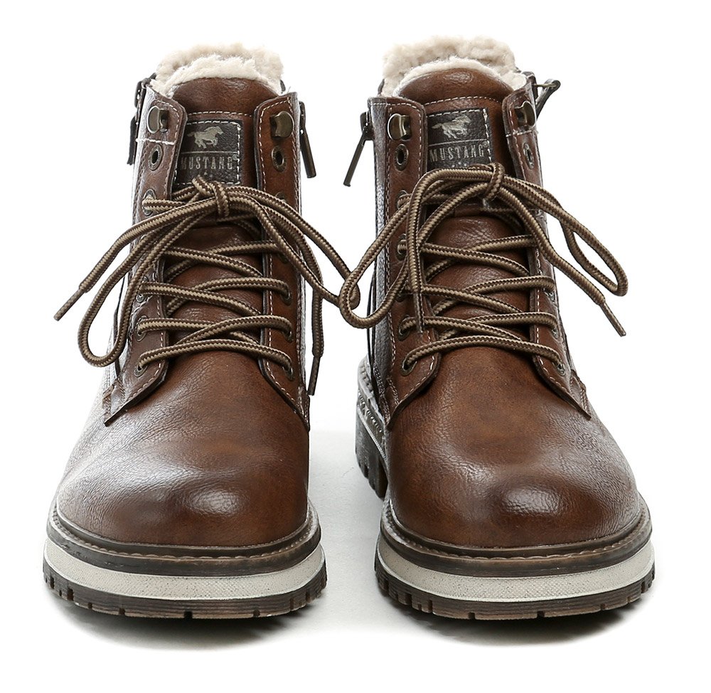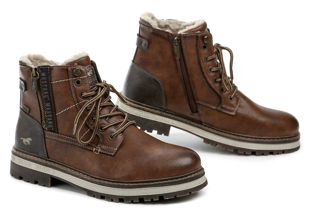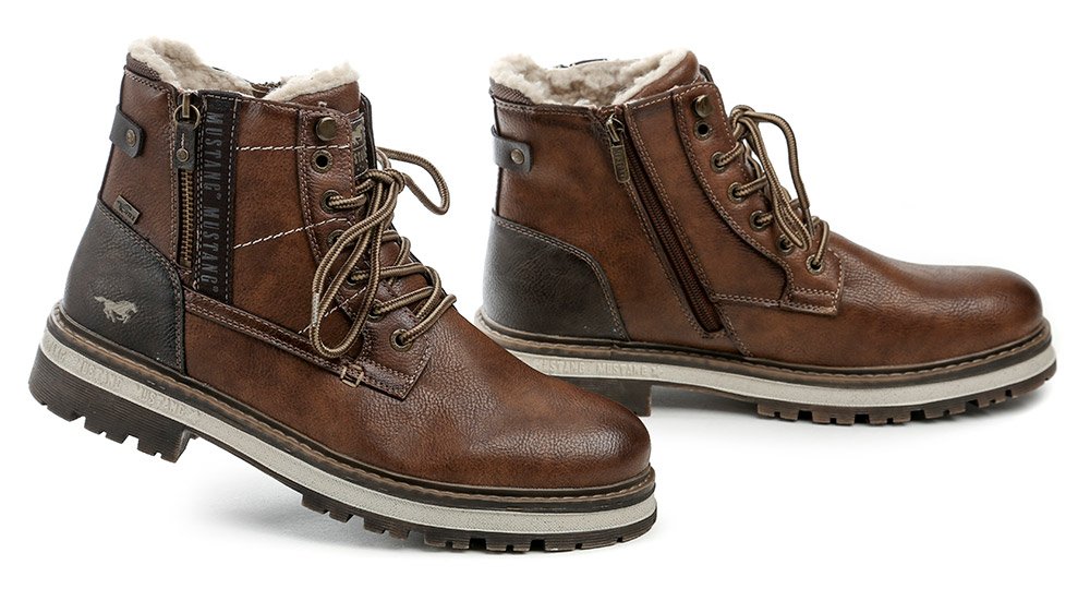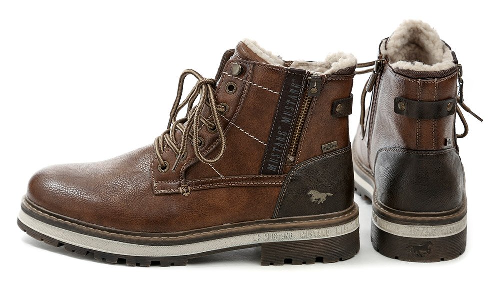 Herren-Winterstiefeletten mit Schnürung und Reißverschluss. Die Schuhe bestehen aus synthetischem Material mit MustangTEX-Membran, innen mit flauschigem Textilfell isoliert.
