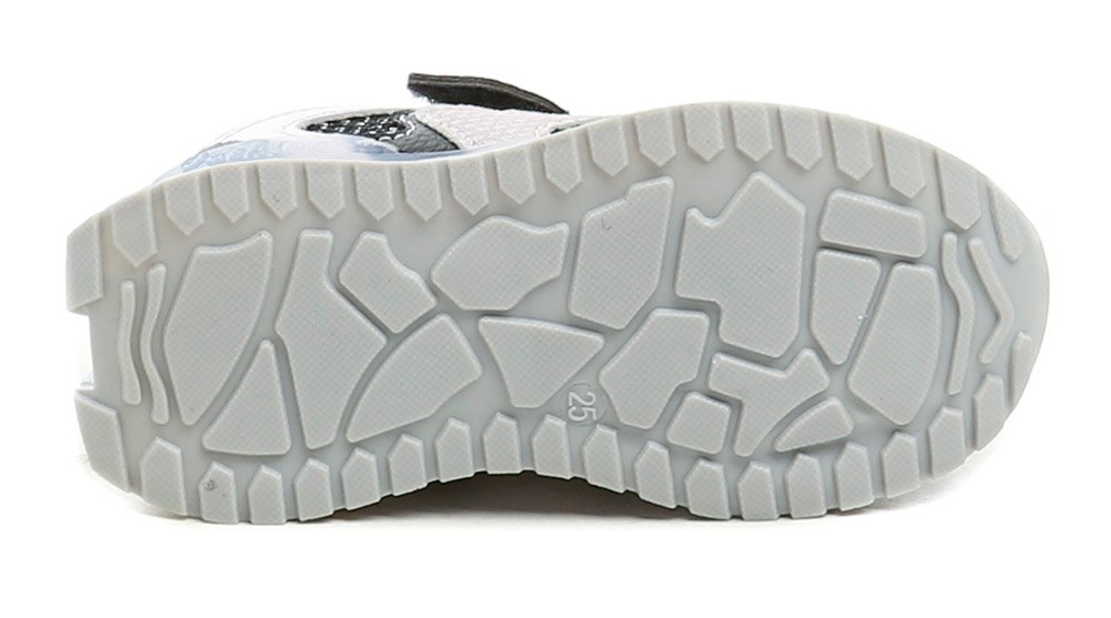 Kinderschuhe für alle Jahreszeiten, ähnlich wie Sneaker, mit Klettverschluss. Das Obermaterial besteht aus einer Kombination aus Kunstleder und Textil, das Innenfutter aus einer Kombination aus Leder und Textil. Die Sohle ist mit farbigen LEDs ausgestattet.